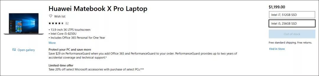 今天,笔者查询微软美国在线商店发现,华为MateBook 13、MateBook和MateBook X Pro三款产品再次出现在该网站中。其中,MateBook X Pro配置为Intel i5、256GB SSD显示为“缺货”状态,其余型号和产品已经可以购买。